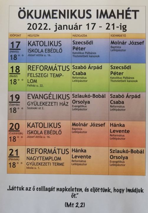 - A mai nap kezdődik az ökumenikus imanyolcad, ami jövő vasárnap zárul. A Krisztus-hívők egységéért szervezett hét anyagát és istentiszteleti rendjét a Közel-Keleti Egyházak Tanácsa állította össze. Ebben a napkeleti bölcsek történetének egy-egy mozzanata jelenik meg az igehallgatók előtt. Az imahét mottója: „Láttuk az ő csillagát napkeleten, és eljöttünk, hogy imádjuk őt.” (Mt 2,2) Az ökumenikus összejövetelek hétfőn este 6-kor kezdődnek a Katolikus Iskola ebédlőjében. A járványhelyzetre való tekintettel idén elmarad az agapé. A részletes program megtalálható a faliújságon és a Tanítványban.